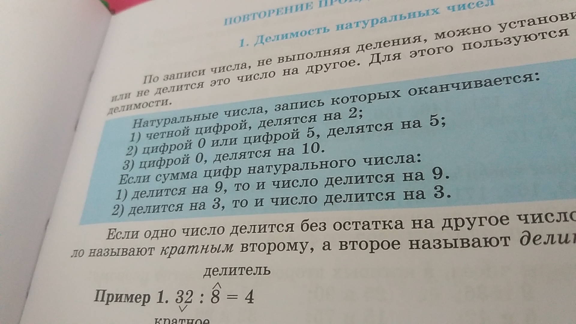 четные числа делятся на2 .это2,4,6,8,10 и т.дчисло делится на 2 если оно оканчиваетсяна0,2,4,6,8.....число делится на 5 если оно оканчивается на о или5 число9 если сумма его цифр делится на 9 .Число 3 если сумма его цифр делится на3