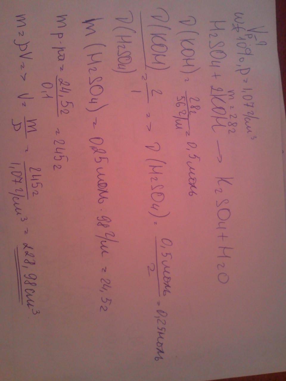 Вычислите объем раствора с массовой долей серной кислоты 10%(плотность= 1,07 г/см3), который потребуется для нейтрализации раствора, содержащего 28 г гидроксида калия.