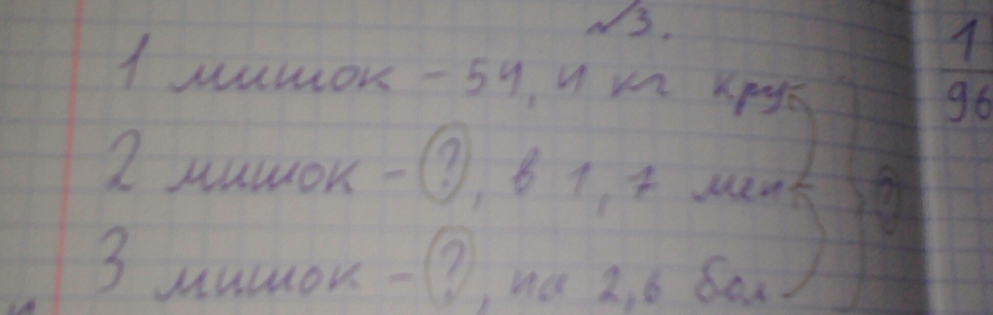 1 мишок 54,4кг с крупой ,2 мишок ?,в1,7меньше 1 мишка,3 мишок?,на2,6 больше 2 мишка,и сколько всево получилось
