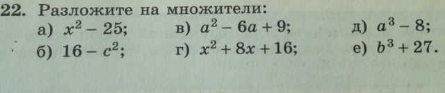 a) x2-25=(x-5)(x+5) ; б) 16-с2=(4-c)(4+c) ; в) a2-6a+9=(a-3)2 ; г) x2+8x+16=(x+4)2 ; д) a3-8=(a2-2)(a+2) ; е) b3+27=(b+3)(b2-3b+9)