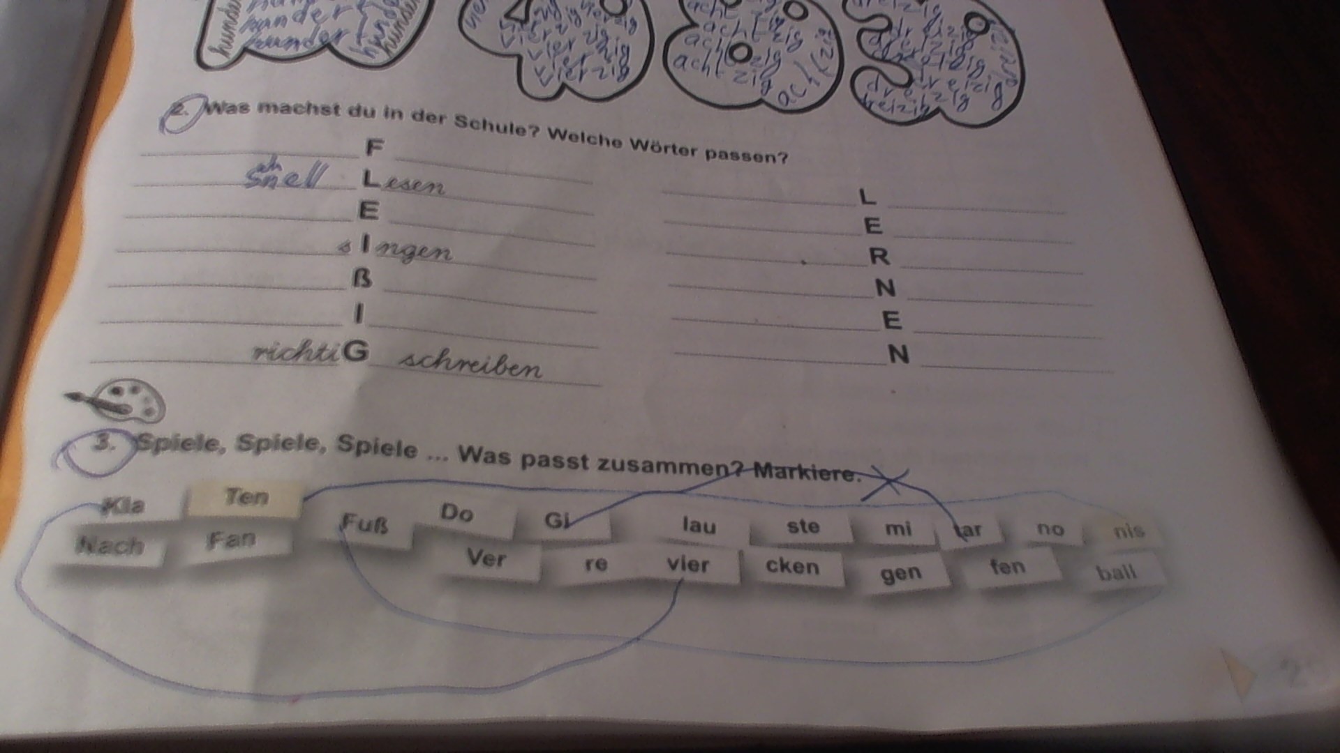 Klavier - пианино, Tennis - тенис, Fussball - футбол, Domino - домино, Gitarre - гитара, Verlaufen - заблудиться, stecken - положить, засунуть,