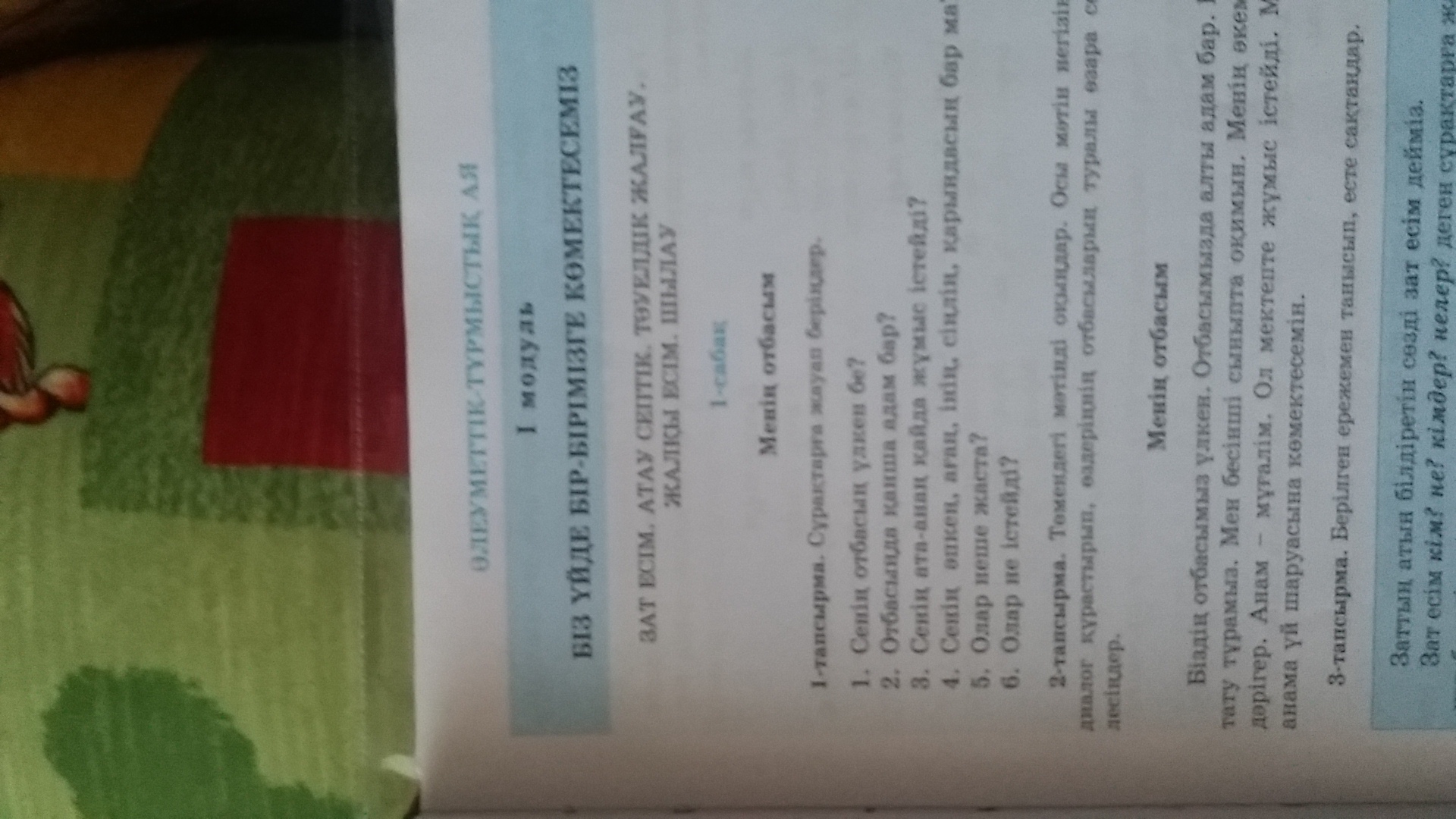 1) Ия менин отьасым улкен 2) отбасымда 4 Адам бар 3) акем милиция болып истиди, анам даригер болып истиди 4) Ия бар 5) апкем 14 жаста агам 16, иним 4 жаста 6) олар мектепте окиды