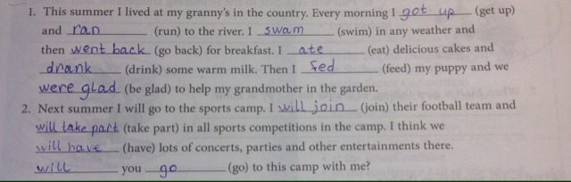 2. Следующим летом я поеду в спортивный лагерь. Я вступлю в их футбольную команду и приму участие во всех спортивных соревнованиях лагеря. Я думаю у нас будет много концертов, праздников и других развлечений там. Поедешь со мной в лагерь?