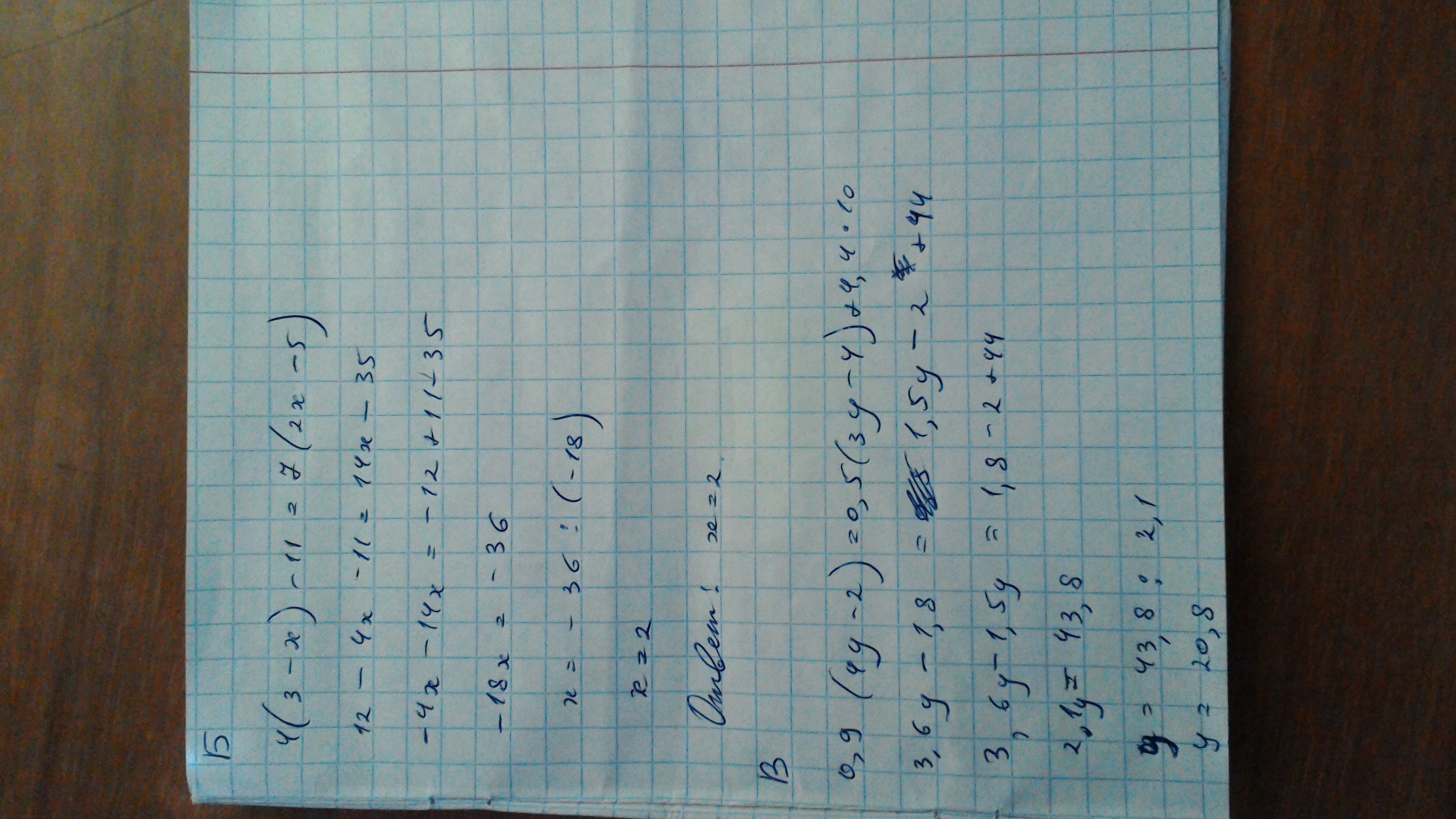 В) 0,9(4у - 2) = 0,5(3у - 4) +4,4 | • 10.