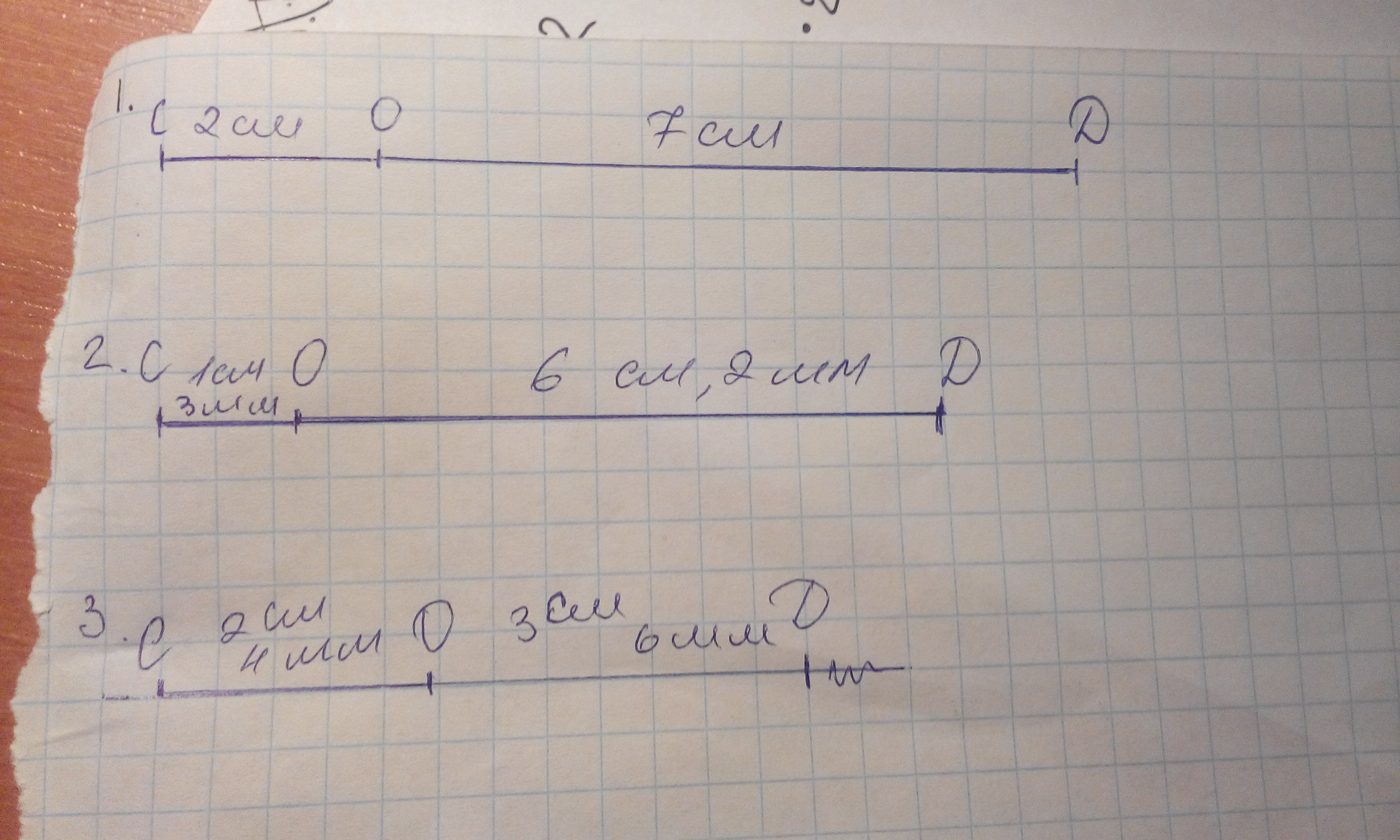 постройте отрезок CD,равный сумме отрезков CO и OD если:1)CO=2см,OD=7см;2)CO=1см3мм,OD=6см2мм;3)CO=3см4мм,OD=3см6мм;4)CO=2см 8мм,OD=4см 7 мм