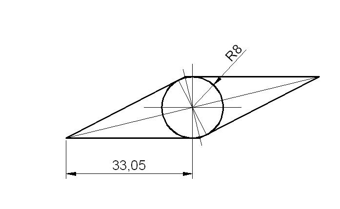 Половина большой диагонали и радиус в точку касания стороны ромба образуют прямоугольный треугольник - L = V((64/2)^2 - 8^2) = V(1156 -64) + V1092 =33,045