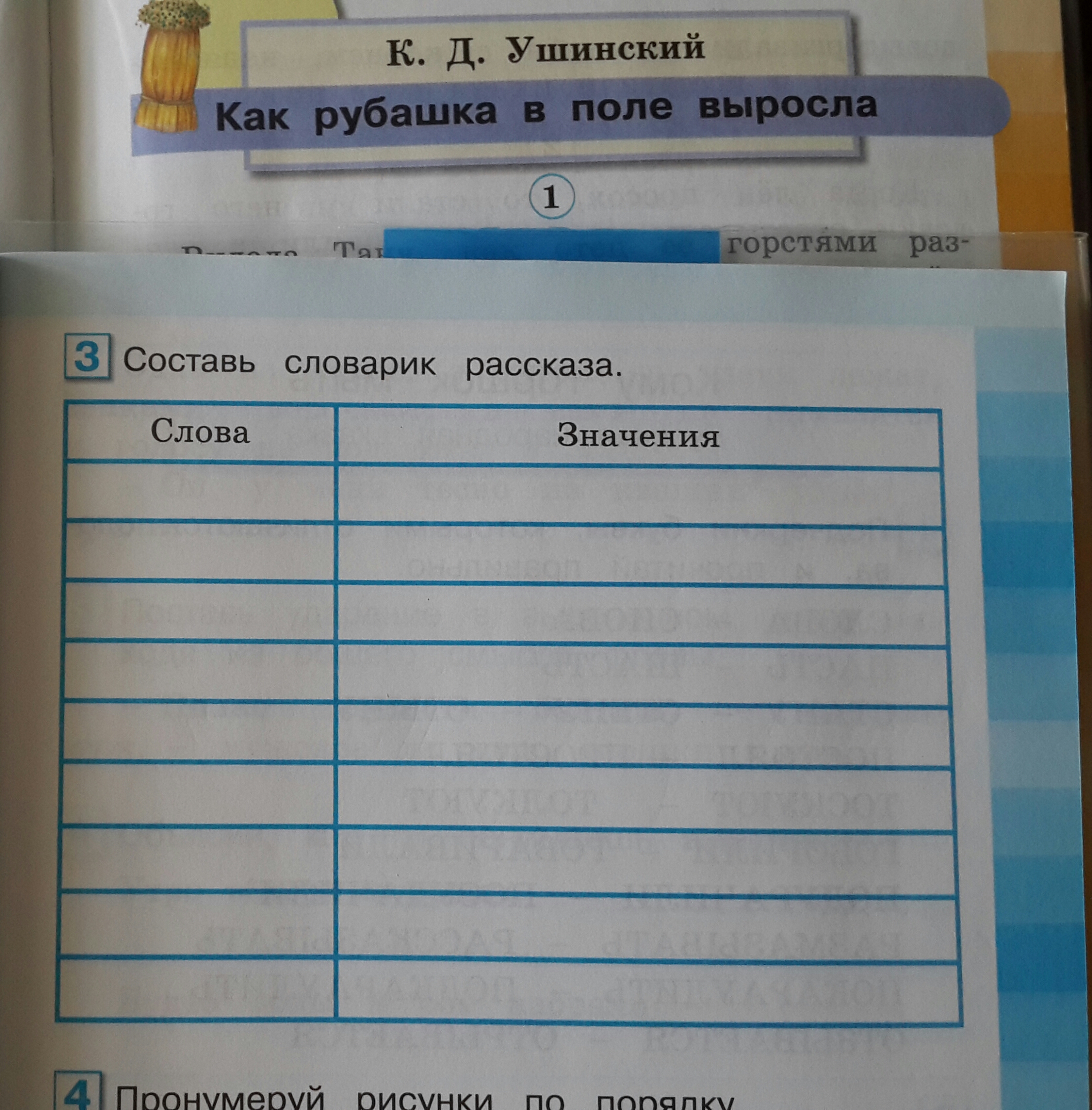 Помогите пожалуйста 3 класс. Составит словарик рассказа. Как рубашка в поле выросла. Вот фото