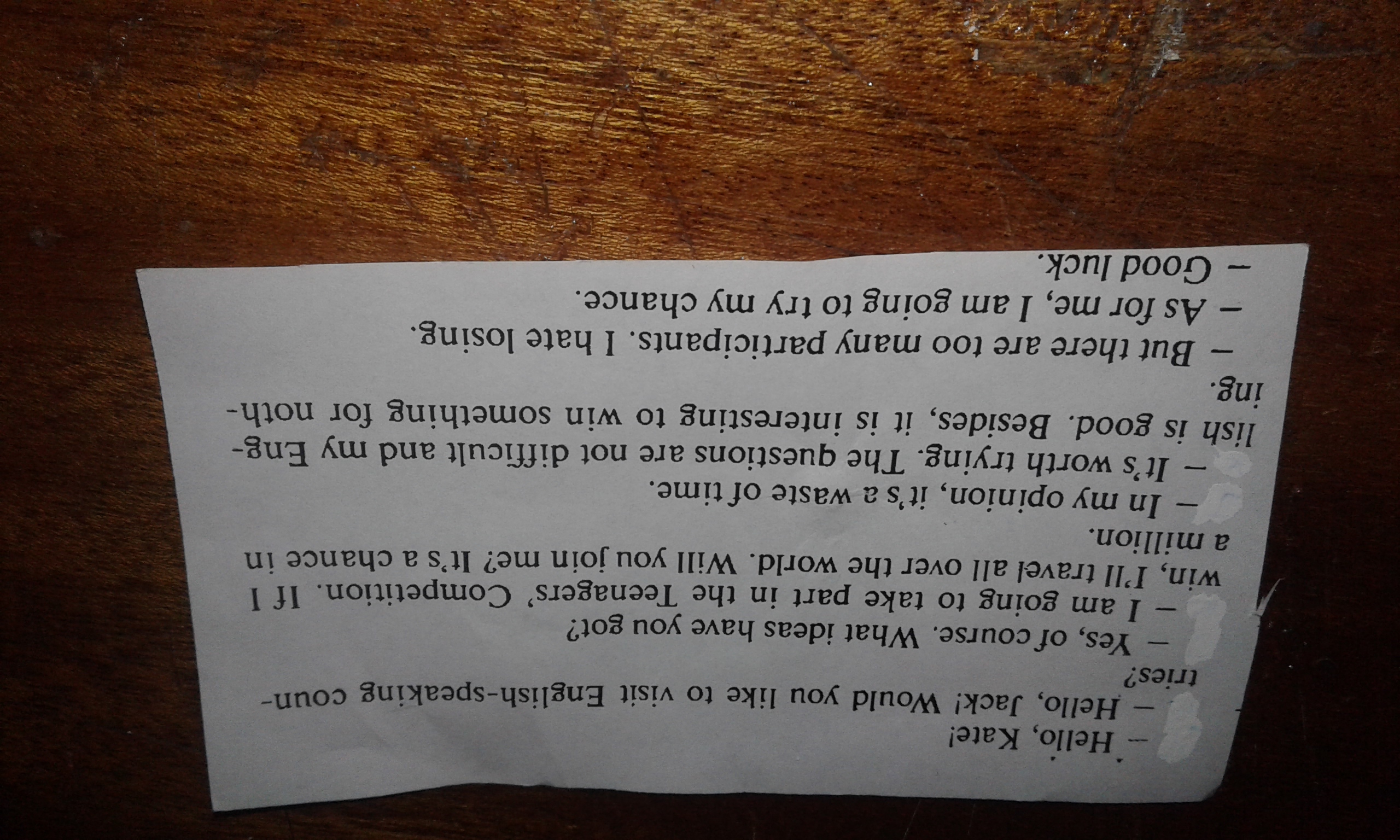 - Привет, Кейт! - Привет, Джак! Ты бы хотел посетить англоговорящие странны? - да, конечно! Какие у тебя есть идеи? - Я собираюсь принять участие в соревнование подростков. Если я выиграю, я буду путешествовать вокруг мира. Ты присоединишься ко мне? Это шанс один на миллион. - По моему мнению- это пустая трата времени. - Стоит попробовать. Вопросы не трудные и мой английский хорош. Кроме того, интересно выиграть что-то из нечего. - Но там слишком много участников. Я ненавижу проигрывать. - Что касается меня, я собираюсь испытать свой шанс. - Удачи.