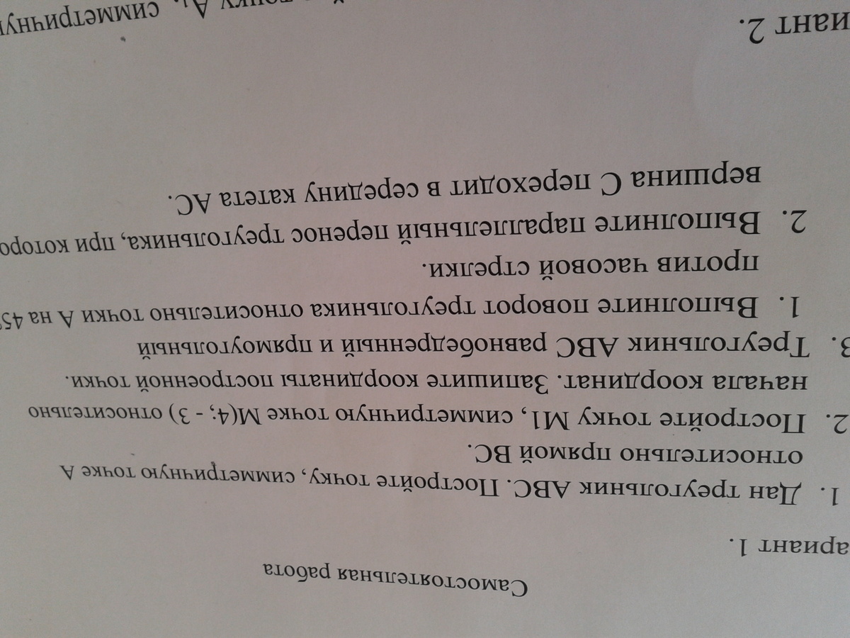 б) Строим серединный перпендикуляр к стороне АС (построение перпендикуляра показано в первом задании, на этот раз проводим две дуги из вершин треугольника). Точка пересечения серединного перпендикуляра и стороны АС будет новой точкой С1. Дальше, не прямой АС откладываем отрезок С1А1=АС. В конце проводим параллельный СВ отрезок С1В1. Строим трегольник. ;)