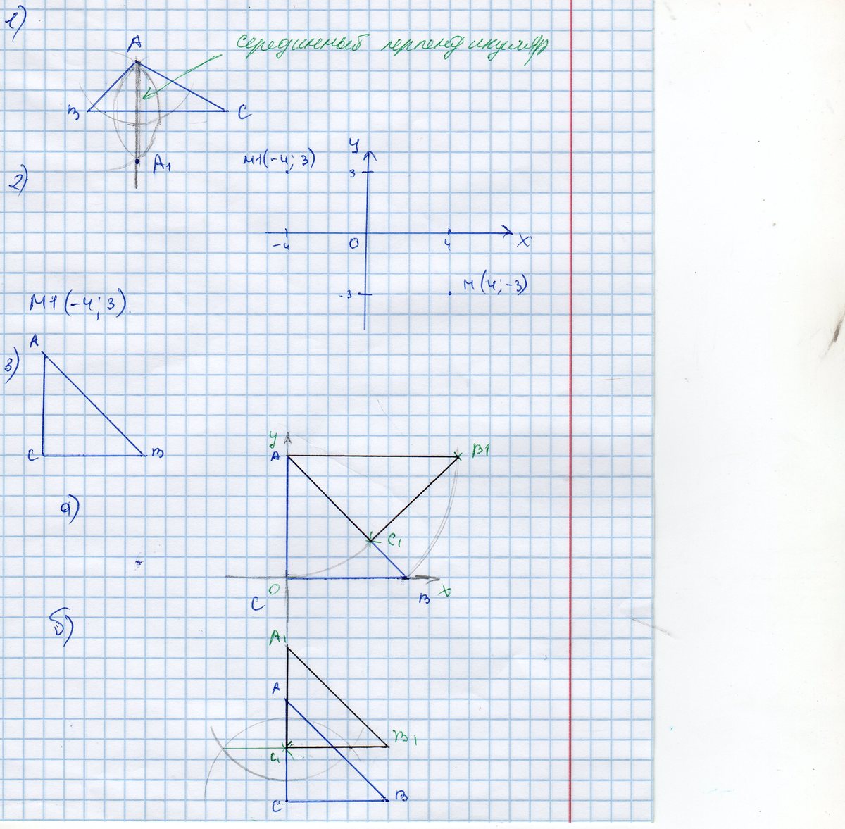 2)В этой задачке просто строим координатную плоскость, строим точку М. Чтобы построить точку, симметричную точке М относительно начала координат, достаточно просто в координатах точки поменять знак на противоположный. Так, точка М1 будет с координатами (-4;3).