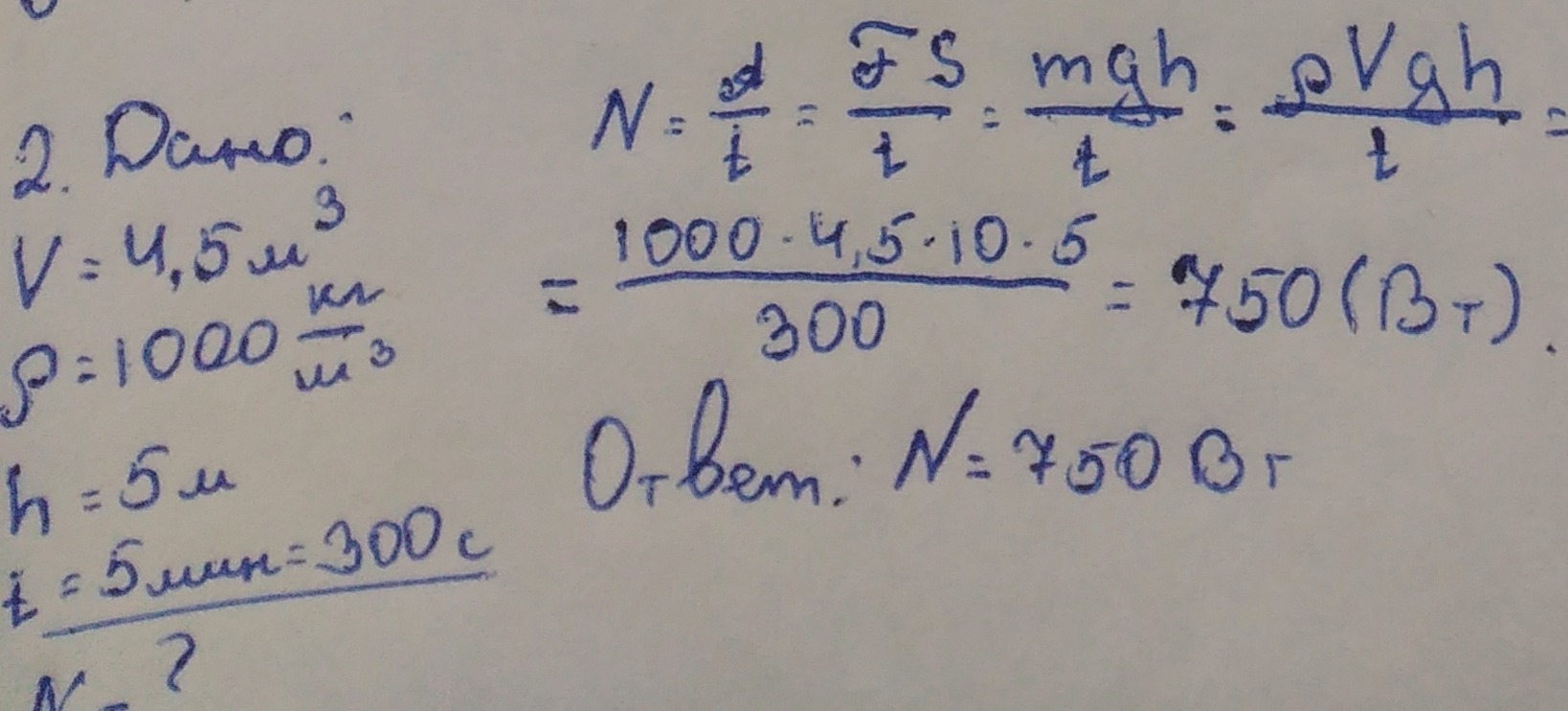 2.Определите среднюю мощность насоса, которая подаёт воду объёмом 4,5м3 на высоту 5м за 5 мин. Ответ:N=750ВТ- 750 ватт