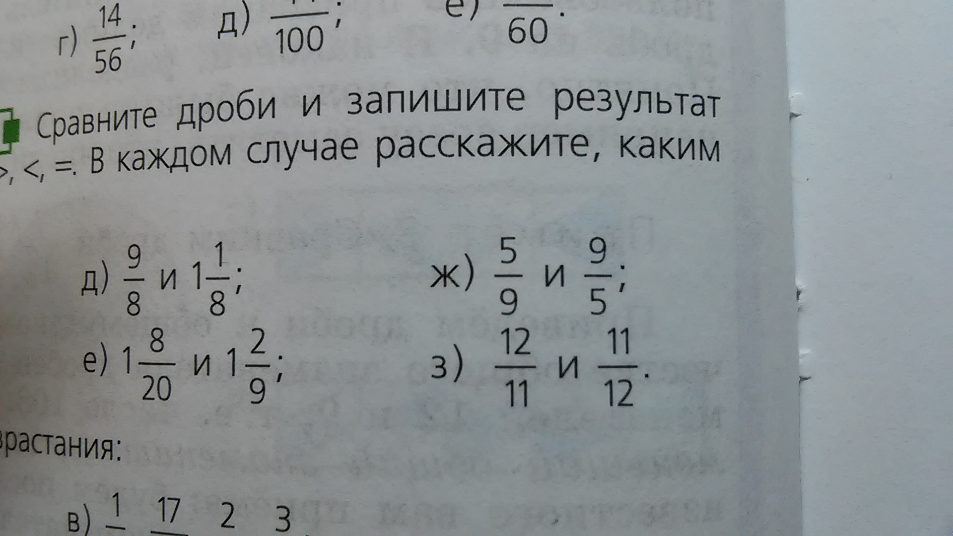 д) 9/8=1 1/8 (1 1/8=1 1/8); ж)5/9<9/5(5/9<1 4/5); з)12/11>11/12(1 1/11>11/12) /-дробная черта