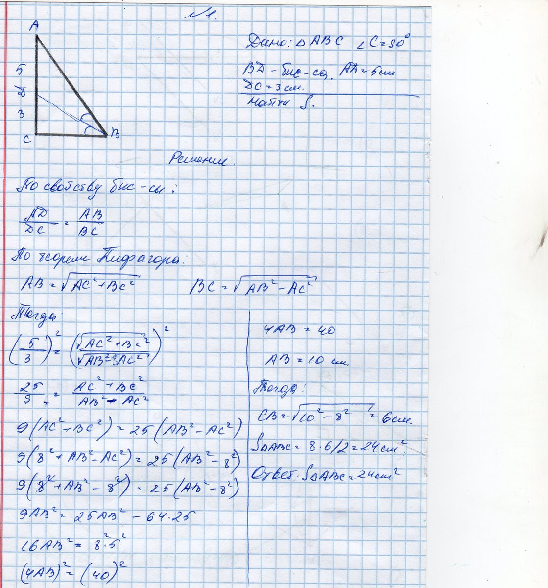 1)биссектриса острого угла прямоугольного треугольник делит катет на отрезки 3см и 5см, тогла площадь данного треугольника равна.