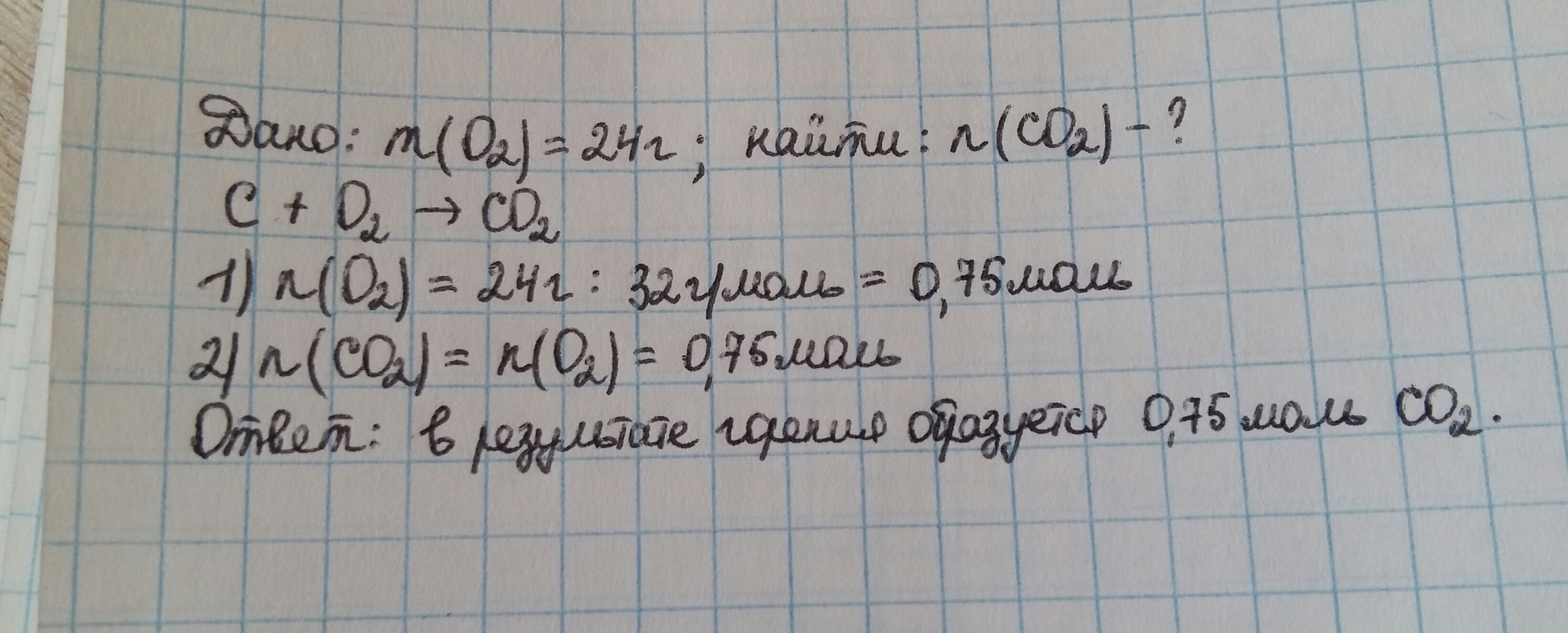 Какое количество (моль) CO2 образуется,если на горение углерода израсходовано 24 г кислорода?Ar(O)=16