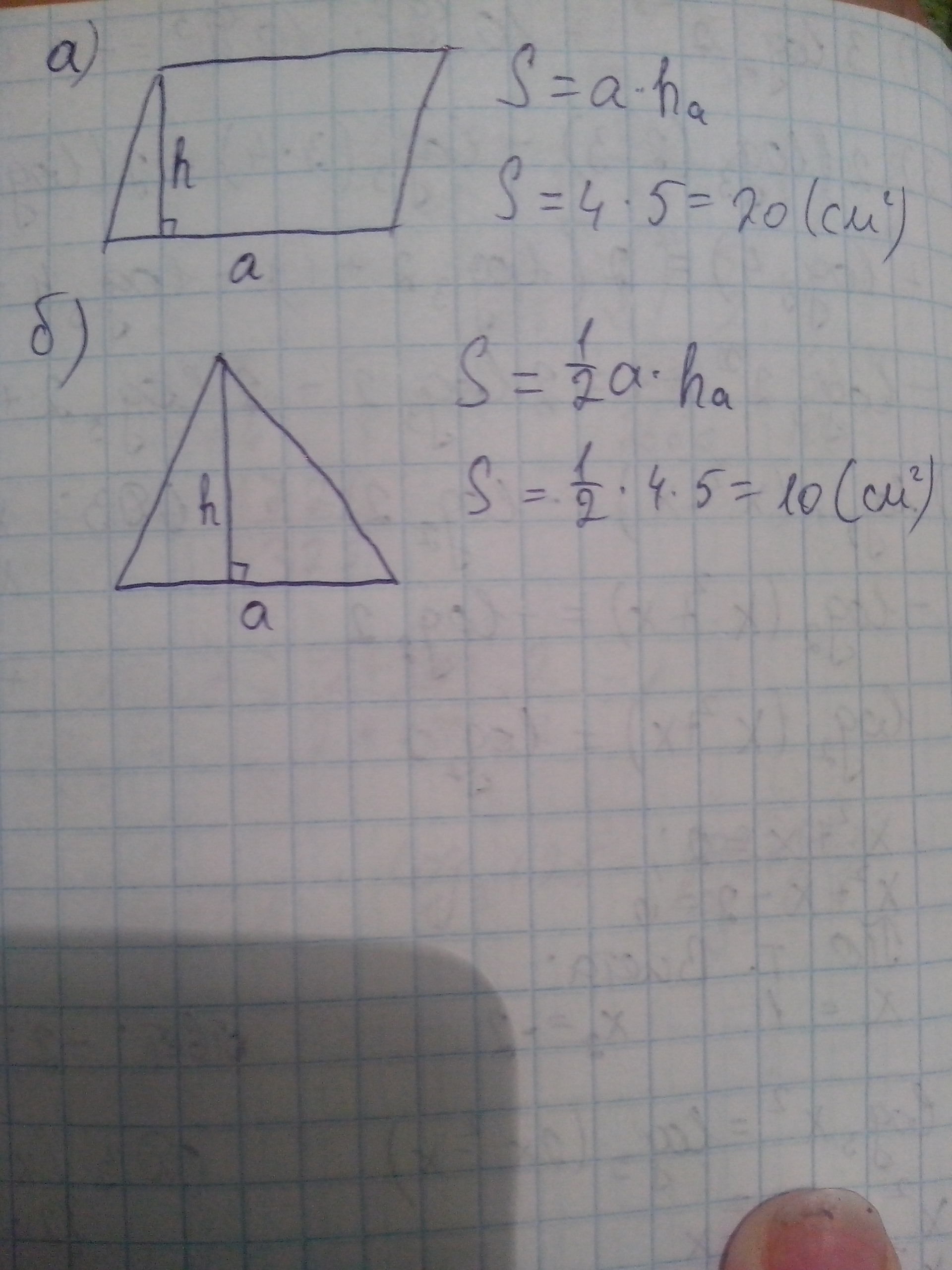 Найдите по основанию "а" и проведенной к нему высоте "h" площадь : а) параллелограмма; Б) треугольника : 1) а= 4см, h= 5 cм;
