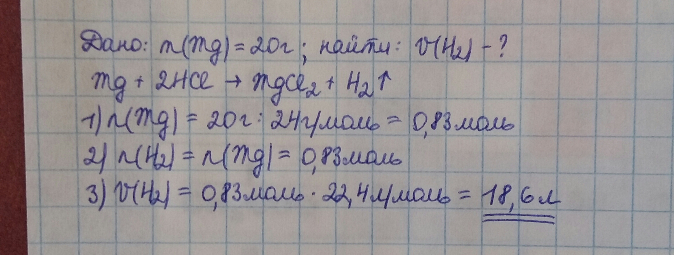 Вычеслить обьем водорода полученого при взаимодействии 20 г магния с хлоридной кислотой