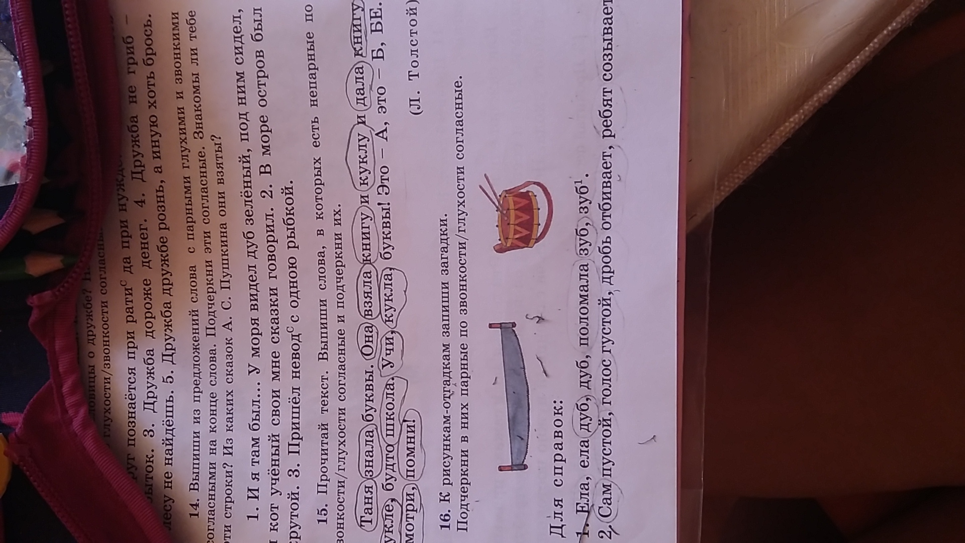 К рисункам отгадкам запиши загадки. подчеркни в них парные по звонкости глухости согласные .