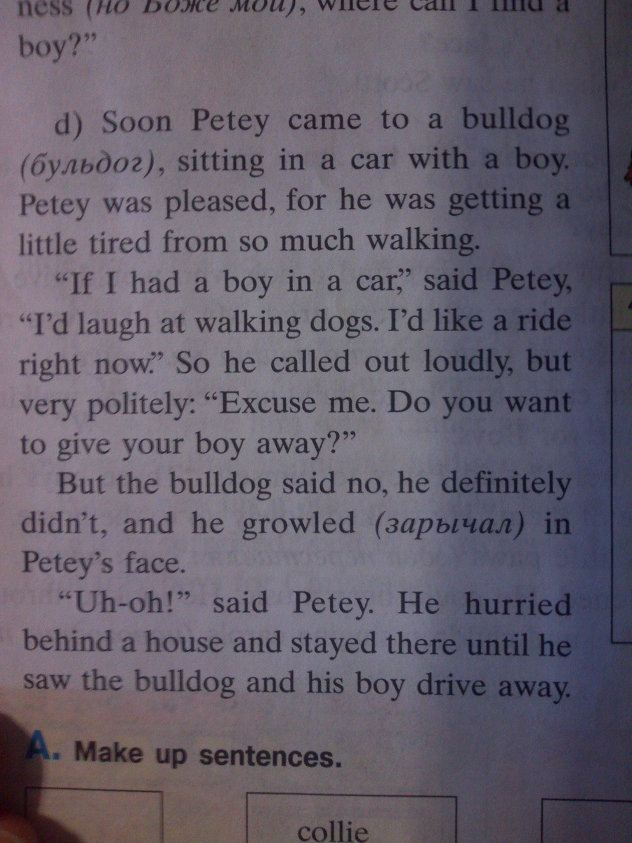 - Ой-ой-ой, - сказал Пити. Он поспешил спрятаться за домом и оставался там до тех пор, пока не увидел, как бульдог и его мальчик уехали.