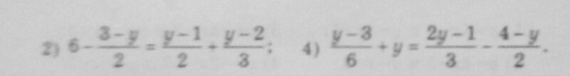 Решите уравнение 2) 6-3-у/2=у-1/2+у-2/3; 4) у-3/6+у=2у-1/3-4-у/2