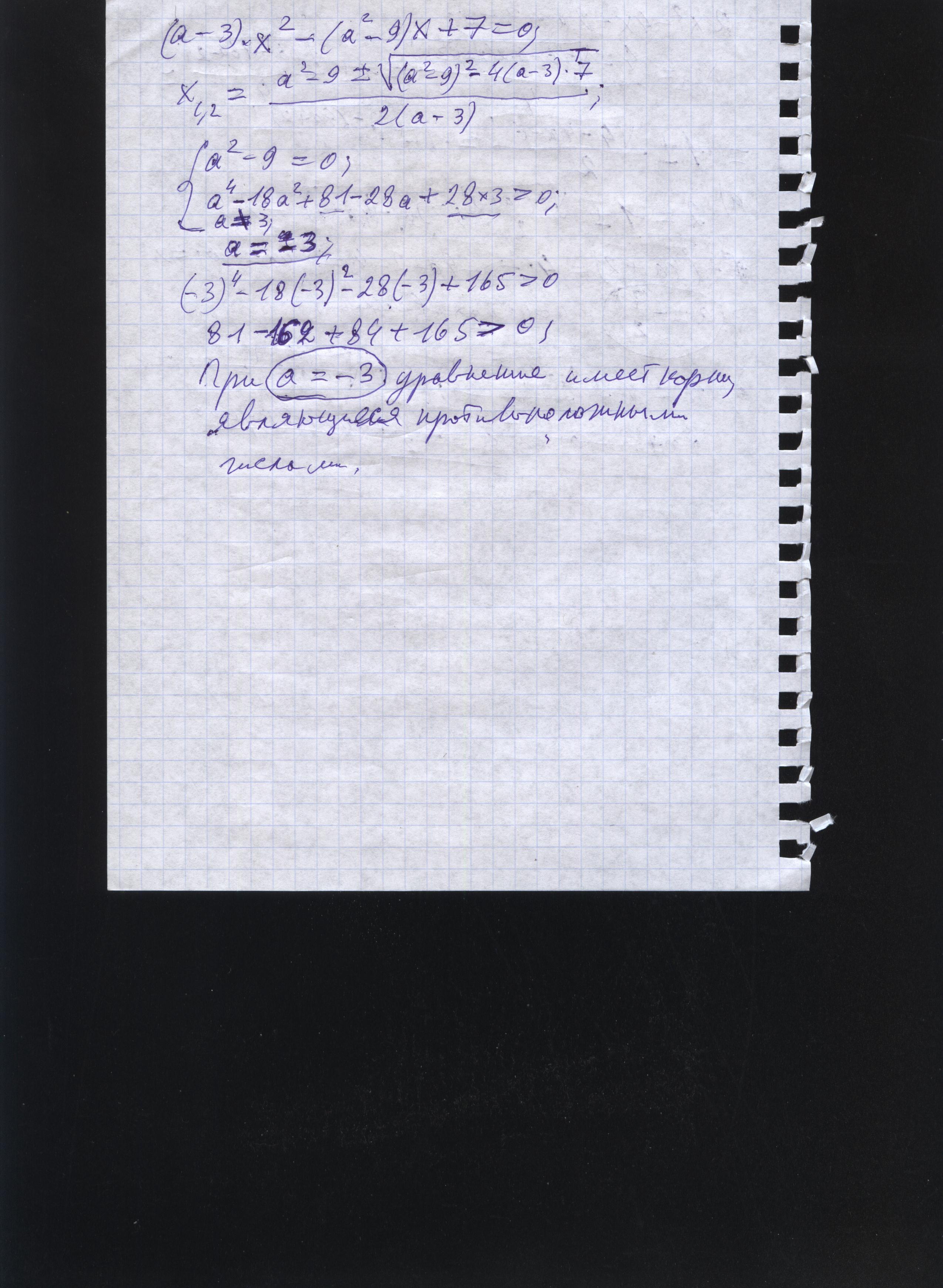 При каких значениях а уравнение (а-3)x^2-(a^2-9)x+7=0 имеет корни, являющиеся противоположными числами?