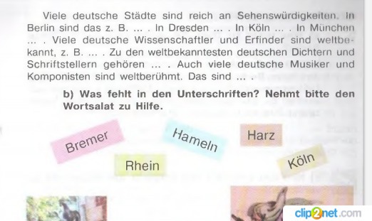 Die Landschaft Deutschlands ist reich an Bergen, Flüssen / Seen und Wälder. Природа Германии богата горными массивами, реками и озерами, лесами. Zu den höchsten Bergen Deutschlands gehören Zugspitze, Schneefernerkopf und Mittlere Wetterspitze. Самые высокие горы Германии - Цугшпице, Шнеефернеркопф и Миттлере Веттершпице. Die größten Flüsse sind die Donau, der Rhein und die Elbe. Самые значительные реки - Дунай, Рейн и Эльба. Als die schönsten Ferienorte sind folgende Gegenden bekannt: die Nordsee, Schwarzwald und Allgäu. Самые красивые места для отдыха расположены в следующих местностях: на Северном море, Шварцвальд и Альгой. Mit vielen deutschen Gegenden sind schöne Sagen und Legenden verbunden. Со многими немецкими местами связаны легенды и мифы Das zeigen die Unterschriften zu den Bilden (S.7). Вы можете узнать это по надписям к картинкам. (страница 7).