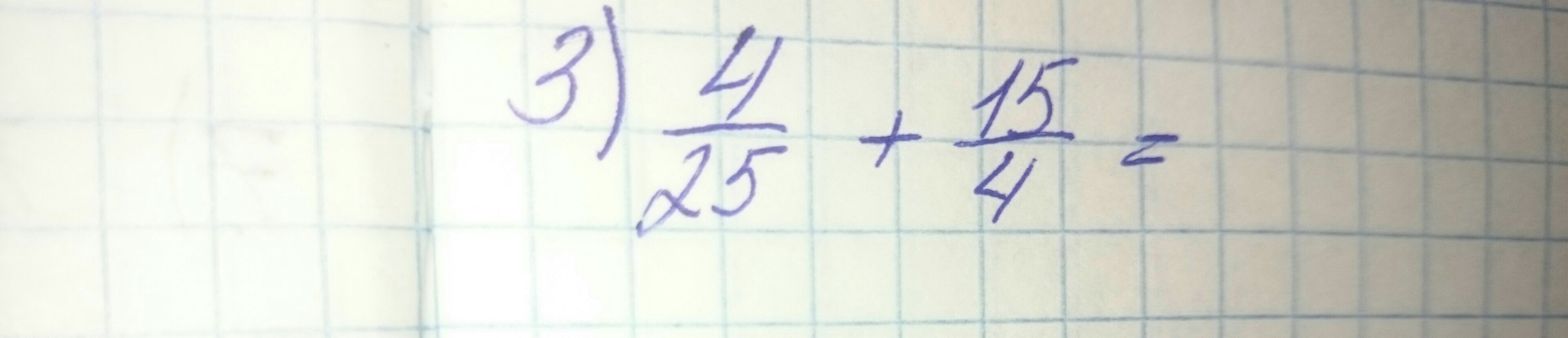 Для начала нам нужно чтобы оба знаменатели были равны. Видим, что 25 на 4 не делится. Ищем такие числа которые делятся и на 25 и на 4.Это 100. И так теперь мы имеем дроби со знаменателями 100. А в числителях нам нужно домножать в первом случае на 4(100/25), а во втором на 25(100/4). И так получаем:16100+375/100=391/100