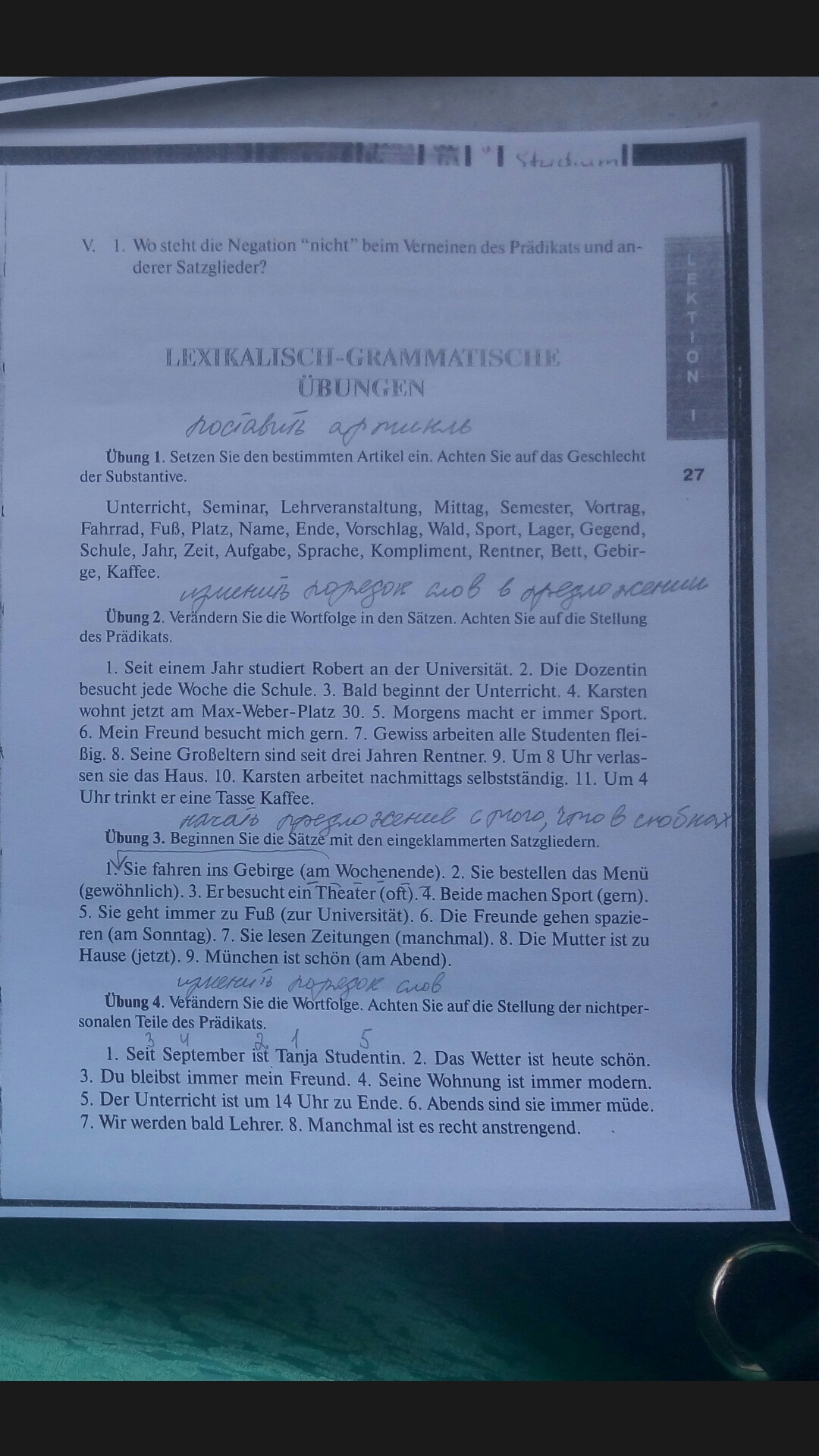 Robert studiert an der Universität seit einem Jahr. Jede Woche besucht die Dozentin die Schule. Der Unterricht beginnt bald. Am Max-Weber-Platz wohnt jetzt Karsten. Sport macht er immer morgens. Gern besucht mich mein Freund. Alle Studenten arbeiten gewiss fleißig. Seid drei Jahren Rentner sind seine Großeltern. Sie verlassen das Haus um 8 Uhr. Nachmittags arbeitet Kartsten selbstständig. Er trinkt eine Tasse Kaffee um 4 Uhr.