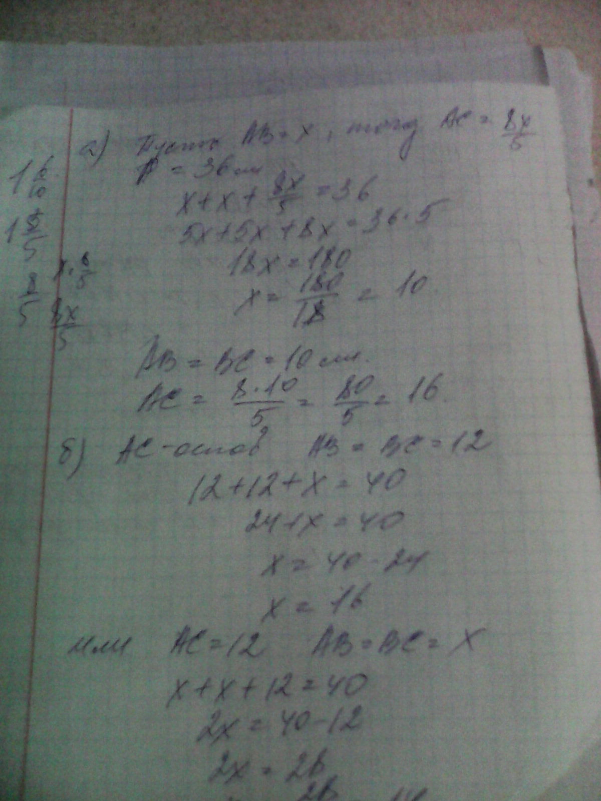 найдите стороны равнобедренного треугольника если а) его периметр равен 36 см и основание состовляет 1,6 боковой стороны; б)его периметр равен 40 см,а одна из сторон 12см