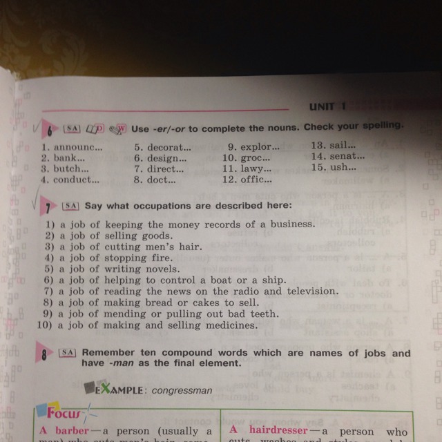 An accountant, a salesperson или a seller, a barber, a firefighter, a novelist, a helmsman , a radio and tv presenter, a baker, a dentist, a pharmacist.