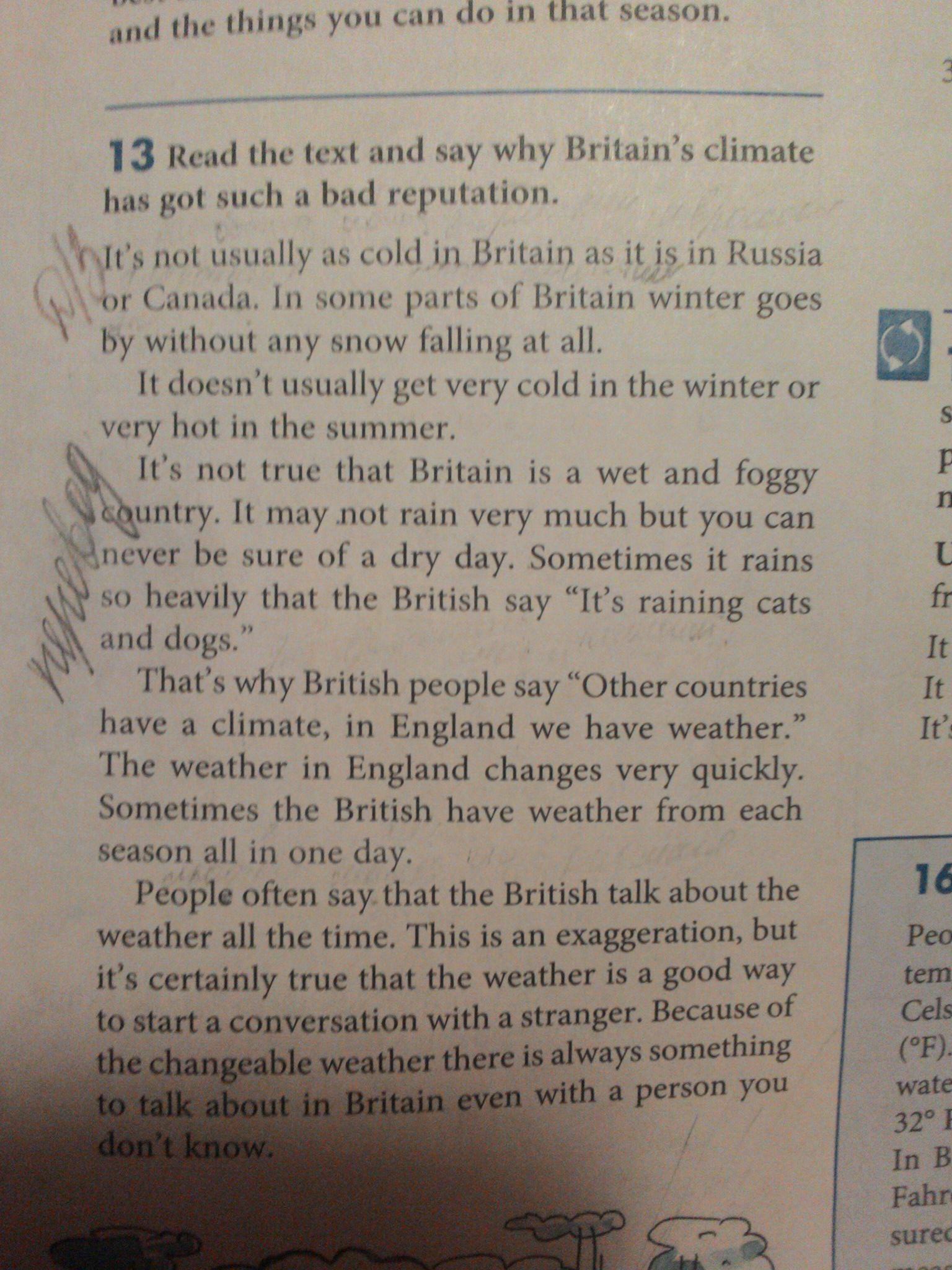 Не верно, что Великобритания - влажная и туманная страна. Может не идти дождь очень, но Вы никогда не можете быть уверены в сухом дне. Иногда идет дождь так в большой степени, что британцы говорят, что "льется кошками и собаками."