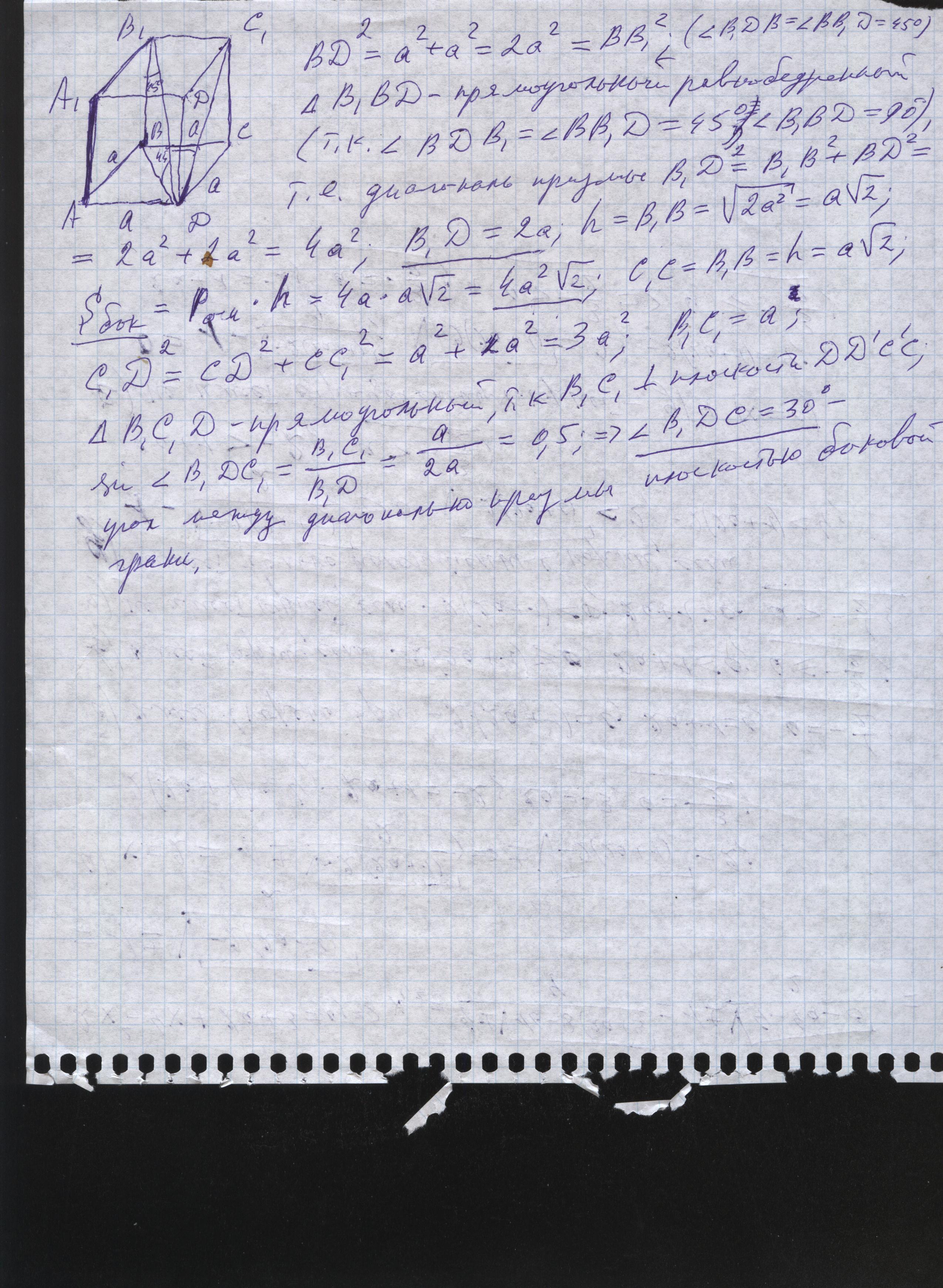 сторона основания правильной четырехугольной призмы равна а,диагональ призмы образует с плоскостью основания угол 45