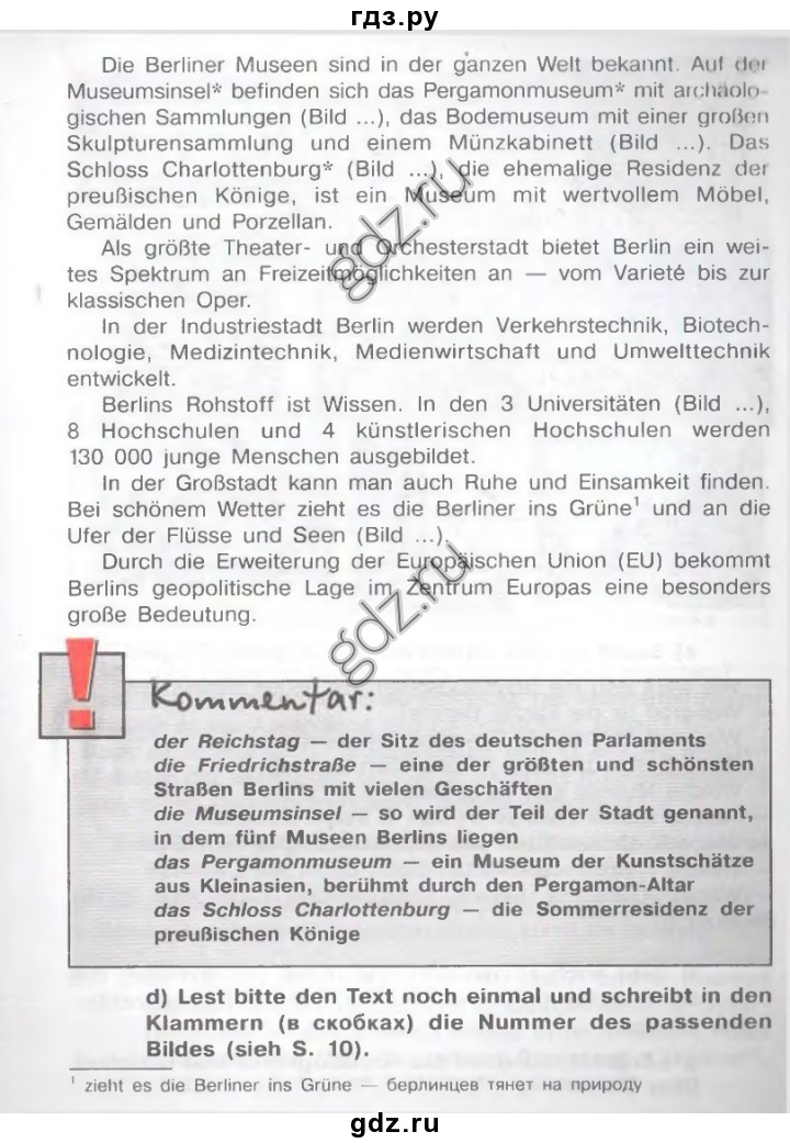- Что вы можете посетить в свободное время в Берлине? Sie können die Friedrichstrasse besichtigen, dort spazieren gehen und einkaufen. Ausserdem können Sie ins Grüne fahren und zum Wasser.