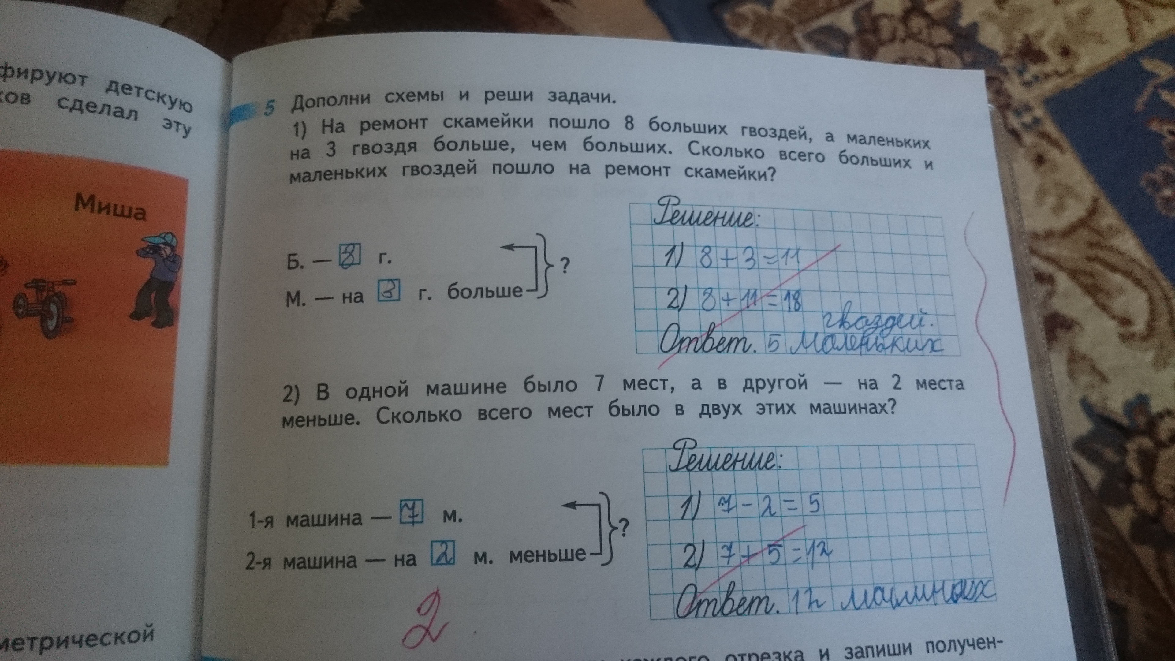 Задача № 1 1) 8+3=11 (г)- маленьких 2) 8+11=19 (г)- пошло на ремонт скамейки . Ответ: 19 гвоздей. Задача №2 1) 7-2 =5 (м)- во второй машине 2) 7+5=12 (м)-в двух машинах. Ответ:12 мест. Вторая задача выполнена правильно, возможно учитель ошибся!