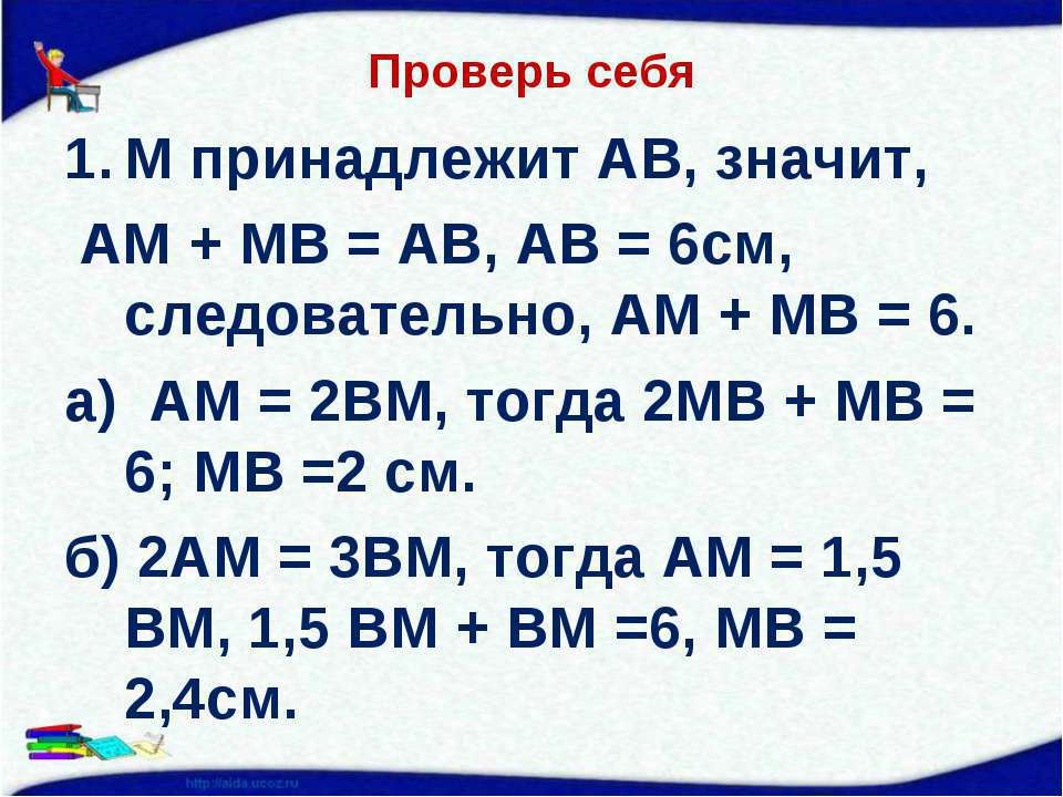 длина отрезка АВ = 6 см. внутри отрезка взята точка М найдите длину отрезка ВМ если а) АМ= 2 ВМ б)3ВМ