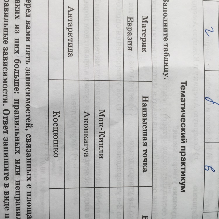 Свою картинку посмотри с таблицей, что ты прикрепил сюда. Материк, высшая точка материка и высота этой точки. Таблицу я твою заполнила.