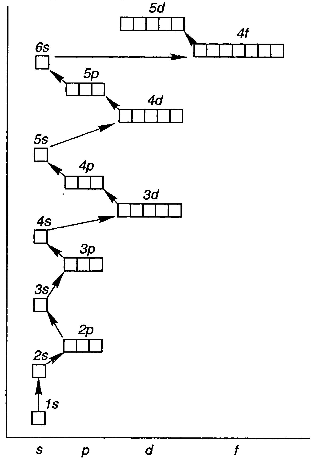 И еще хорошо бы выучить последовательность заполнения электронами квадратиков (см. рисунок). Начиная с самого низа по стрелкам можно понять куда ставить электроны. И еще важно помнить, что начиная заполнять p или d или f подуровни сначала ставим по одному электрону, а затем добавляем остальные.