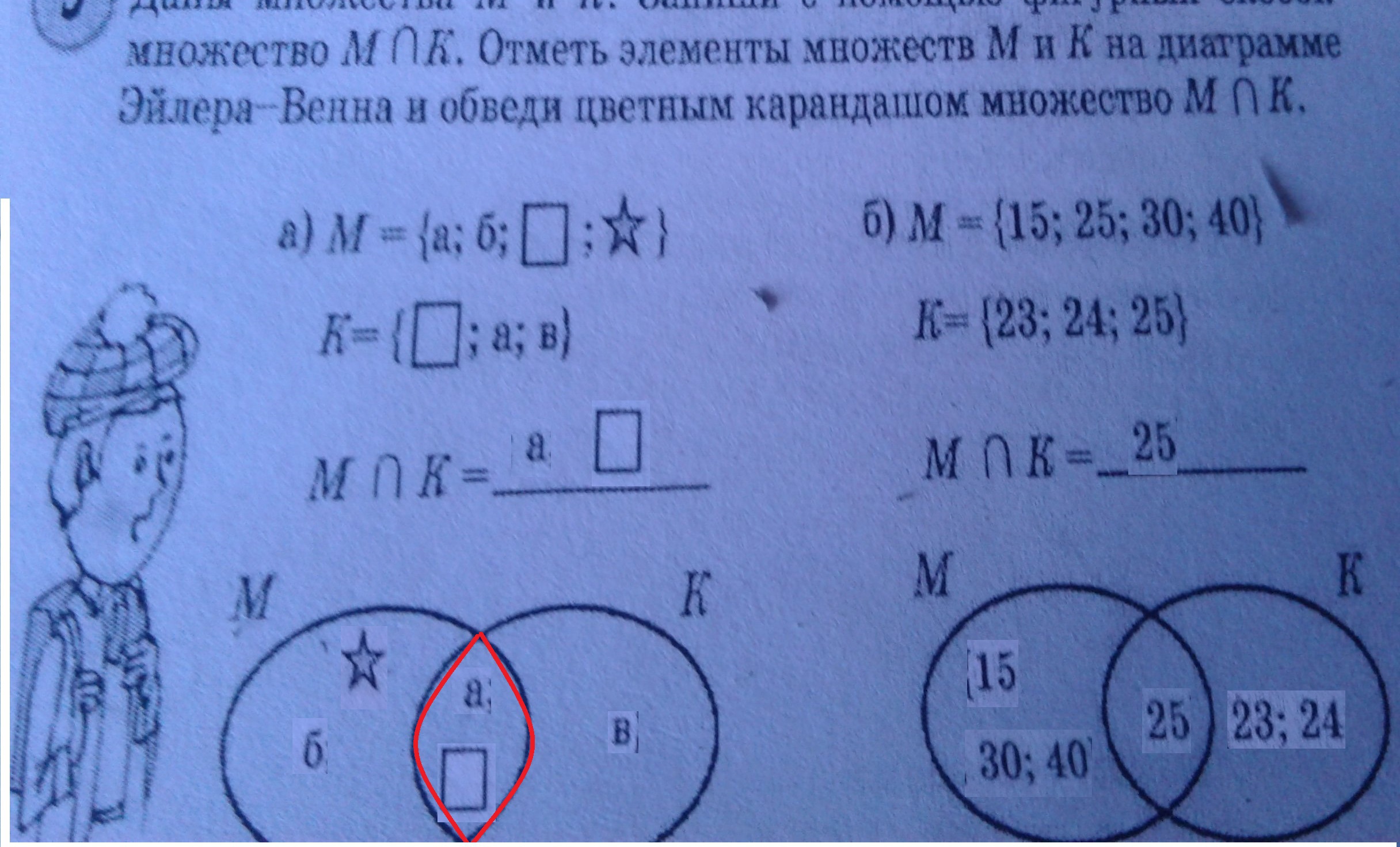 В задаче надо найти ОБЩИЕ элементы множеств, как на рисунке.