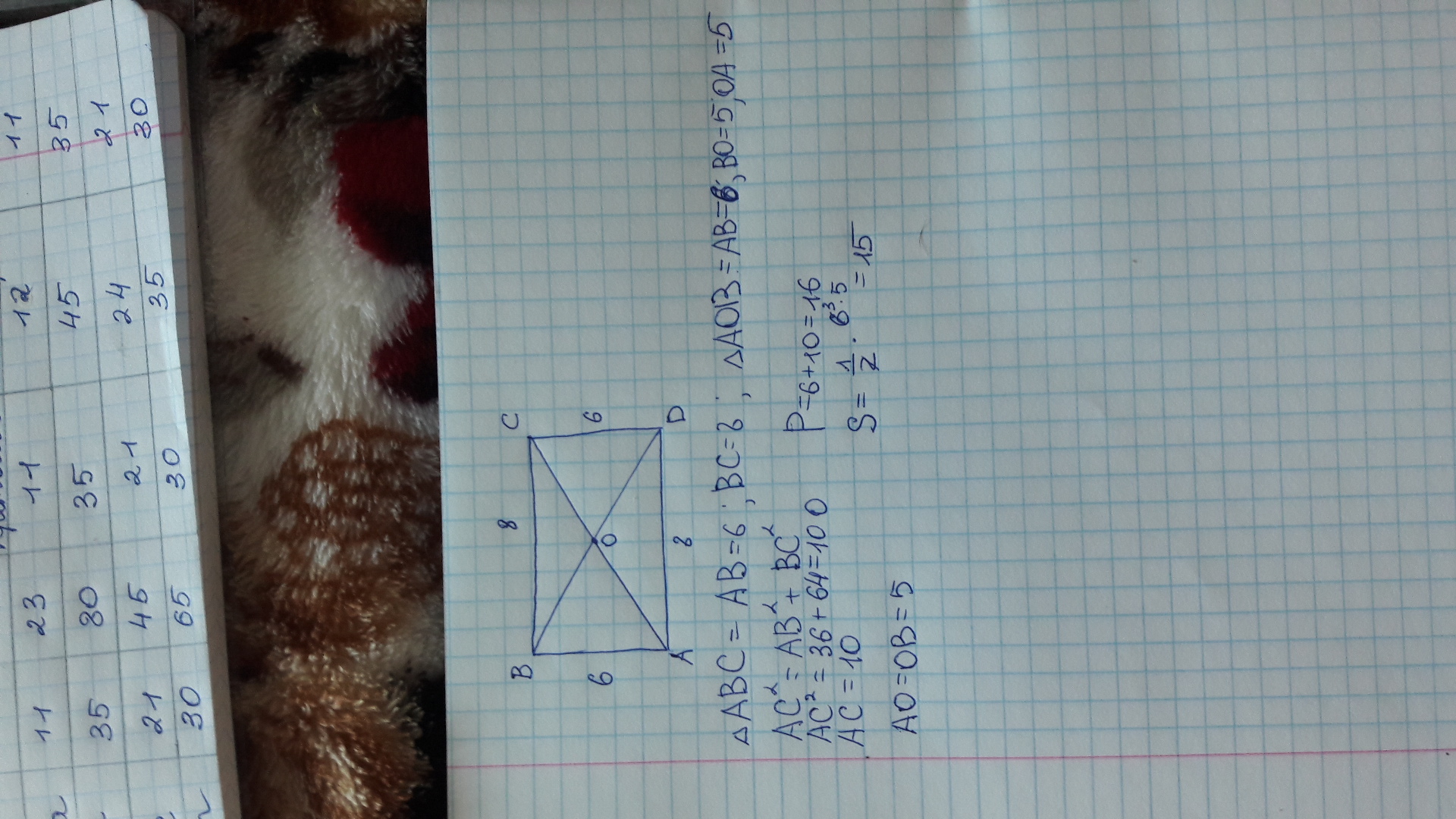 Дан прямоугольник АВСД. ВС 8,ВА 6. ВД и АС диагонали прямоугольника пересекаюстся в точе О. Найти площадь АОВ, периметр АОВ