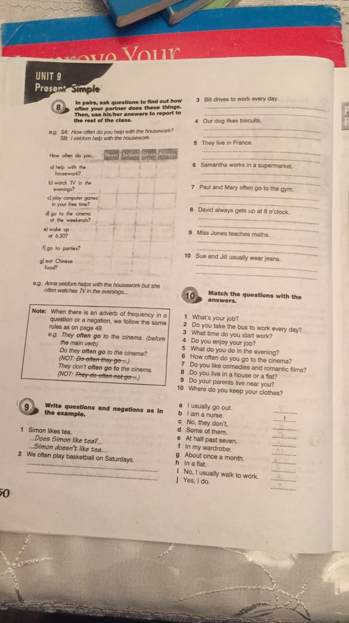 9. 2) Do we play basketball on Saturdays often? We don't play basketball on Saturdays often. 3) Does Bill drive to work every day? Bill doesn't drive to work every day. 4) Does our dog like biscuits? Our dog doesn't like biscuits. 5) Do they live in France? They don't live in France. 6) Does Samantha work in a supermarket? Samantha doesn't work in a supermarket. 7) Do Paul and Mary go to the gym often? Paul and Mary don't go to the gym often.