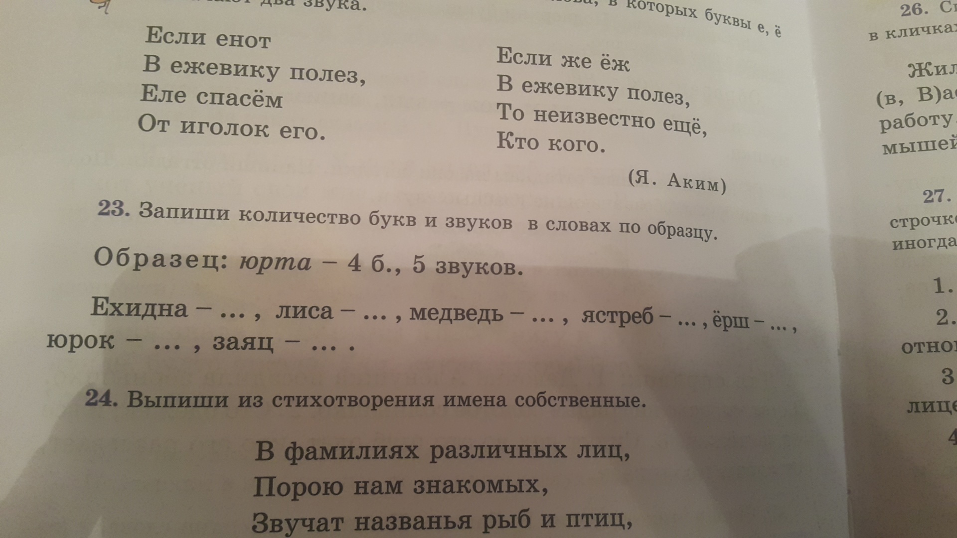 Ехидна - 6 б, 7 зв., лиса - 4 б., 4 зв., медведь-7б.,6 зв., ястреб - 6 б., 7 зв., ёрш - 3 б., 4 зв., юрок - 4 б., 5 зв., заяц - 4 б., 5 зв.