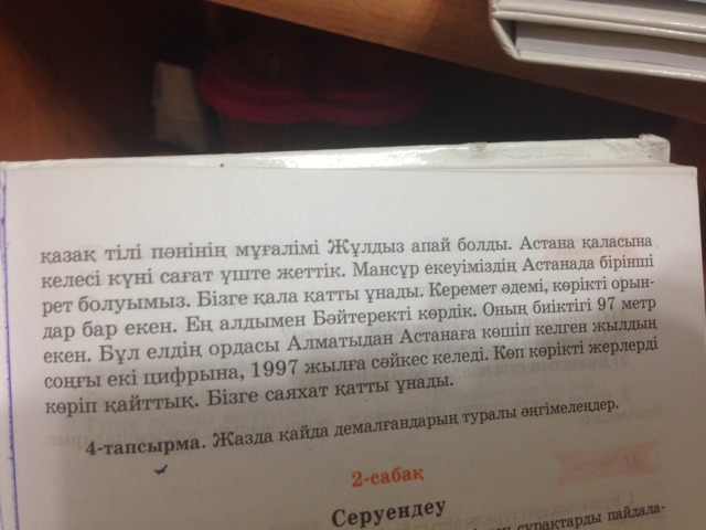 учиельницей казахского языка стала Жулдыз апай . Мы приехали в город Астана к трем часам.Мы с Мансуром впервые в Астане . Город нам очень понравился.Там есть очень красивые места. Сначала мы просмотрели Бәйтерек.Его высота 97 метров .