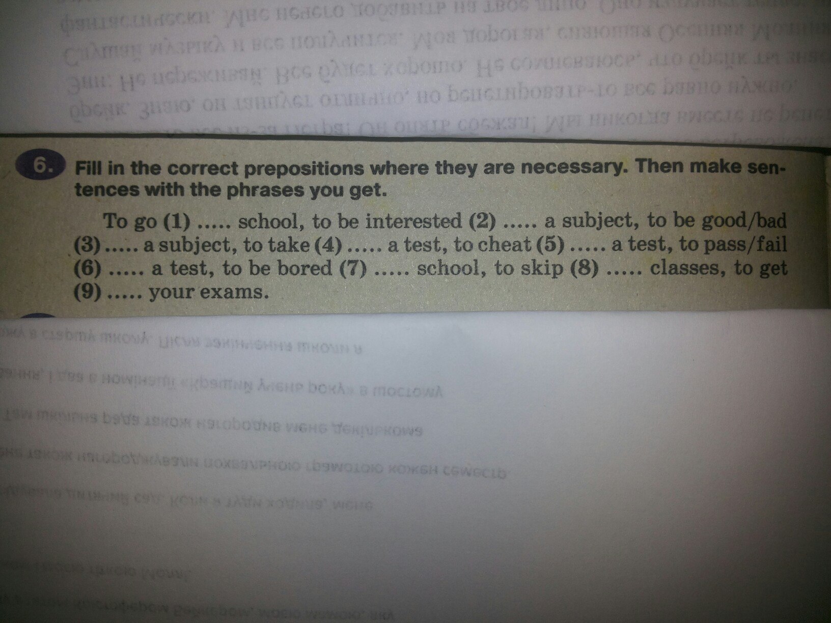 To, in, at, -, on, -, at, -, through. 1. I have to go to school five days a week. 2. I am interested in many subjects at school. 3. I could never understand Maths, I am so bad at this subject. However, History is my favourite subject, I am very good at it. 4. I will have to take a test at the end of the year. 5. I have never cheated on a test. 6. I hope to past an English test this year, but I am afraid I might fail a Maths test. 7. Kate and Josh are always bored at school. 8. It's a bad idea to skip classes because it will affect your grades. 9. We can't wait until we finally get through all our exams.