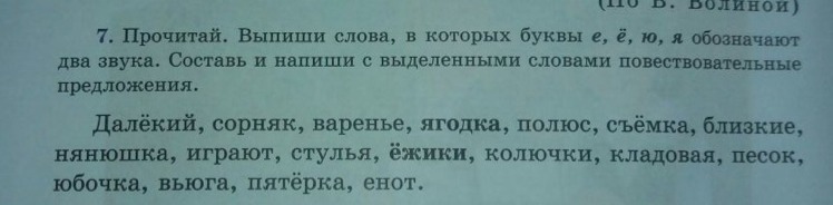 выписываем слова: варенье, съёмка, играют, стулья, ёжики, кладовая, юбочка, вьюга, енот.