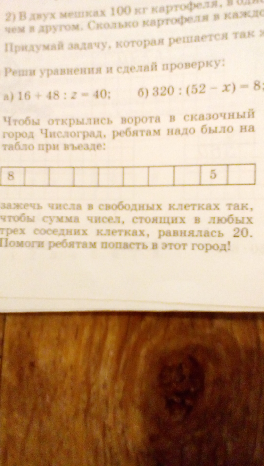 в общем вводи в таблицу числа 8, 7 и 5, именно в этом порядке, так, какие бы три клетки ты не возьмешь в сумме получится 20