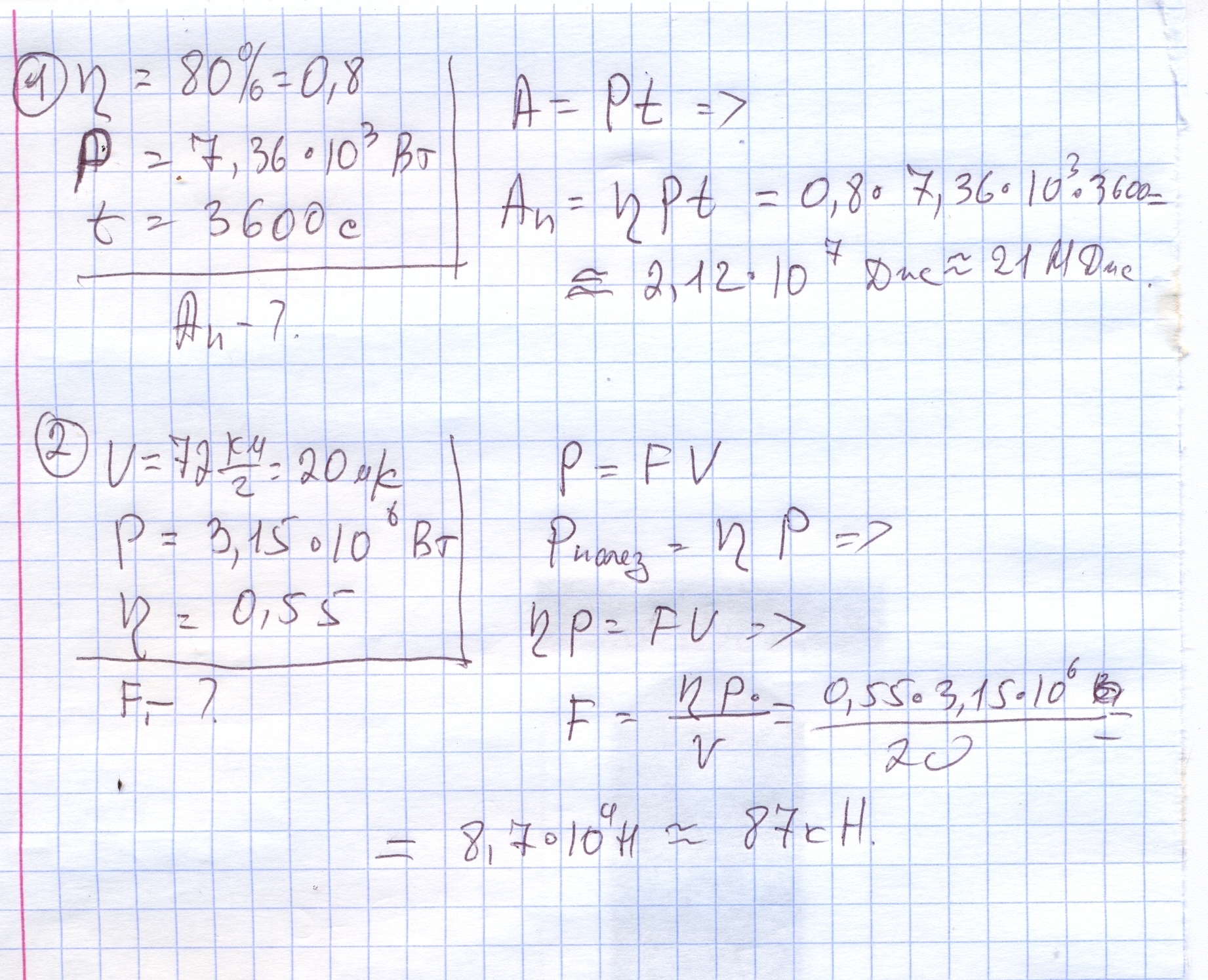 1. Коэффициент полезного действия насоса, приводимого в движение мотором мощностью 7,36 кВт, равен 80%. Сколько полезной работы произведет этот насос за один час? Ответ: приблизительно 21,6 МДж