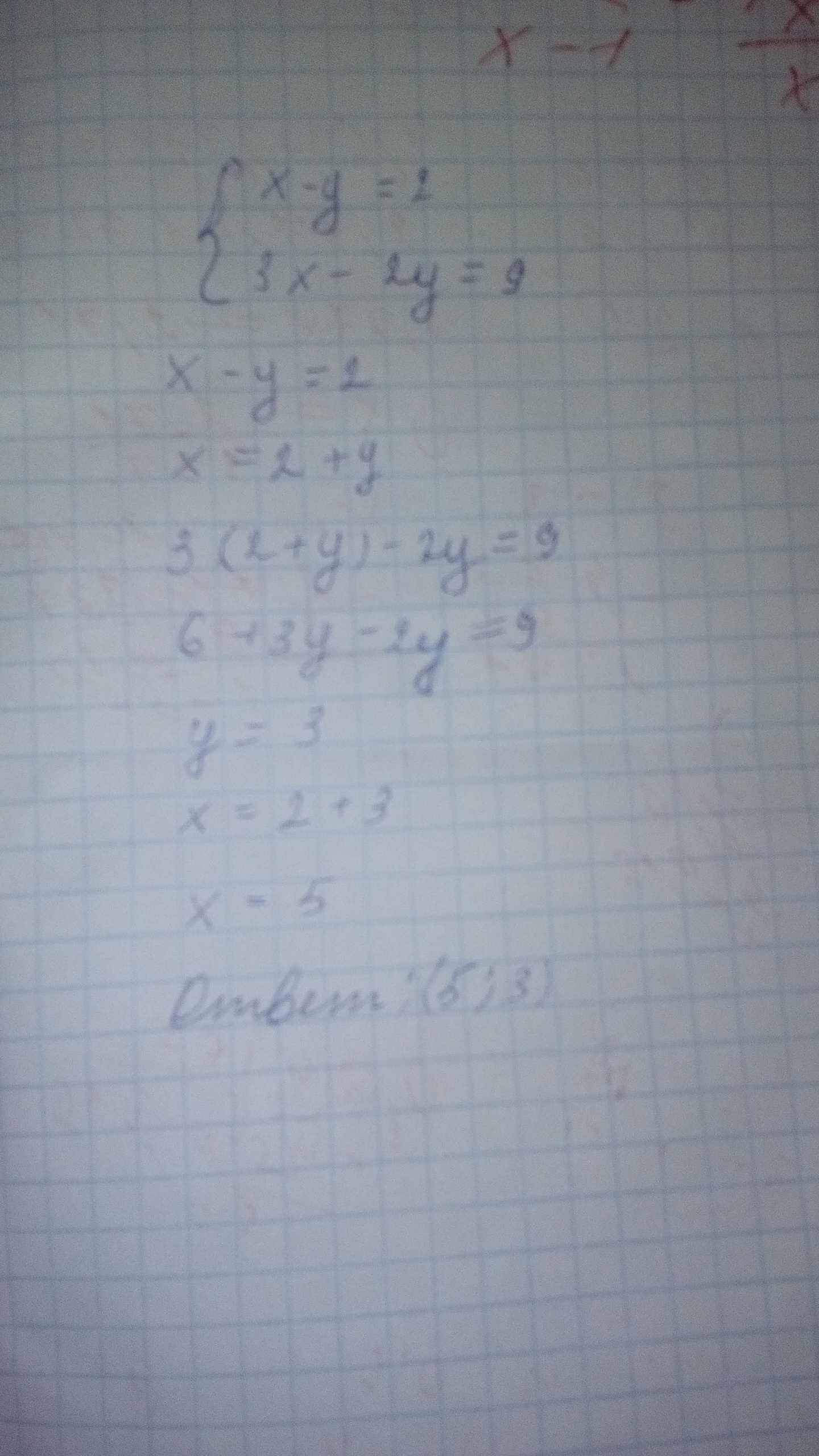 вырази х или у . допустим , выразим х , и того будет х=2+у , и подставляй в нижнее уравнение