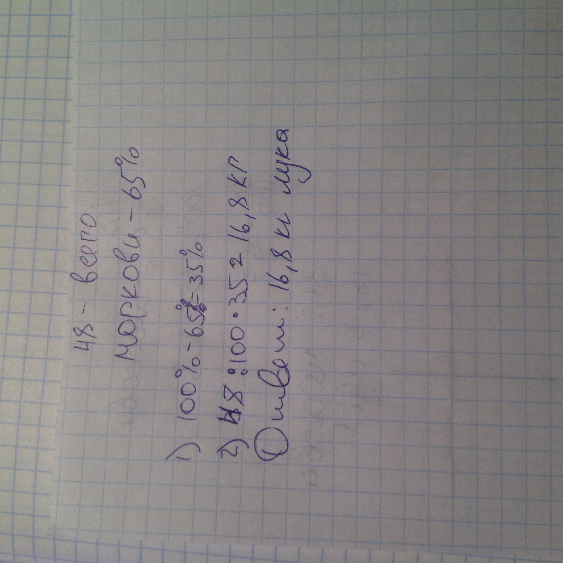 Cо школьного участка собрали 48 кг моркови и лука,морковь составляет 65%всех собранных овощей а остальные лук.Сколько лука собрали с участка?