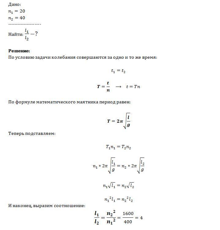 За одно и то же время один математический маятник совершил n^1=20, а второй маятник— n^2=40 колебаний. Как соотносятся их длины?