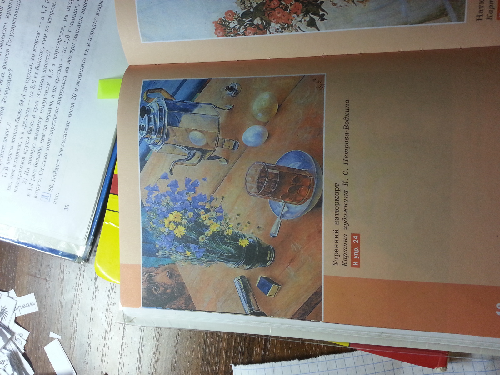 на картине изображен утрений натюрморт. художник К.С Петров-Водкин.он изобразил бакал с чаем, 2яйца и ваза с синими и желтыми цветами ,а на заднем плане деревяная статуя льва.картина чем то напоминает утренний завтрак .по ней видно что художник хотел передать свое утро