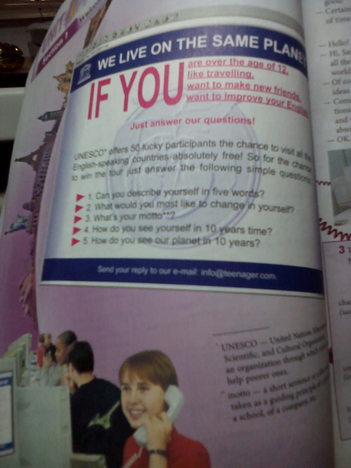 1. Могли бы вы описать себя в пяти словах? 2. Чтобы вы больше всего хотели изменить в себе? 3. Каков ваш девиз? 4. Как вы себя видите через 10 лет? 5. Какой вы видите нашу планету через 10 лет?